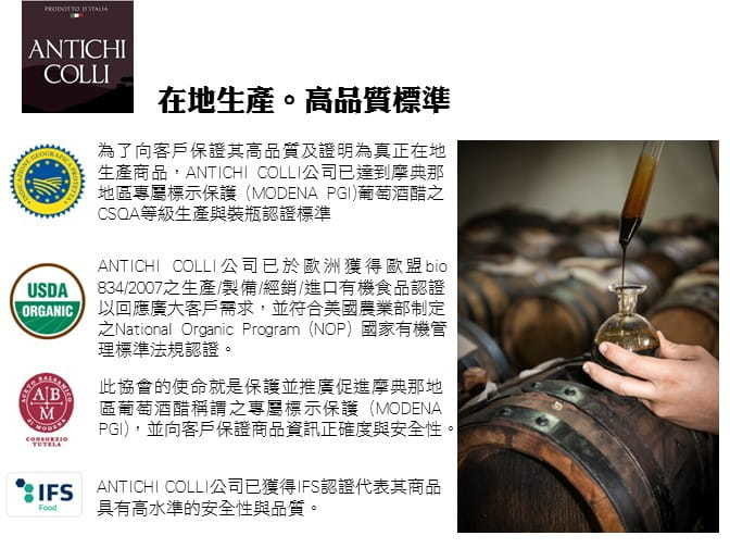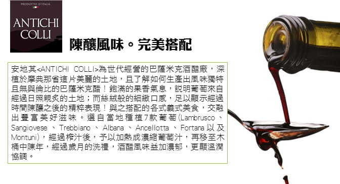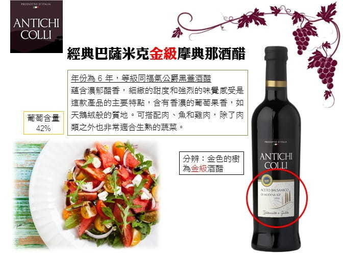 成份:摩典娜酒醋(酒醋、濃縮葡萄汁)、濃縮葡萄汁、熟煮葡萄汁