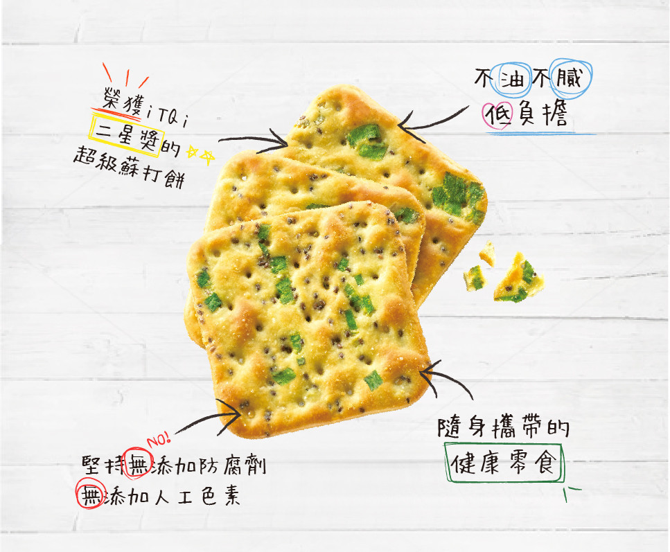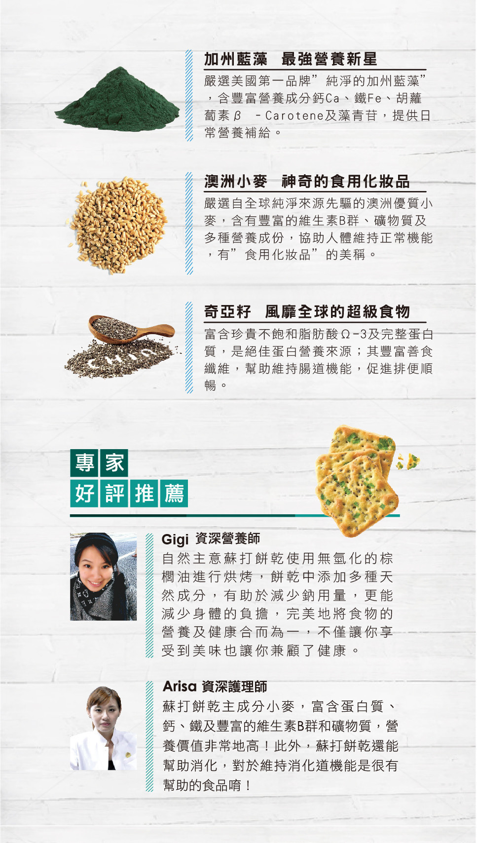 ◎ 選用天然優質小麥及美國加州螺旋藍藻,搭配散發濃郁蔥香的新鮮青蔥、岩鹽等成分,遵循自然發酵熟成◎ 烘焙,散發出麵粉獨特的香氣。給您超級活力的健康餅乾使用的無氫化的棕櫚油,給您最無負擔的享受 !