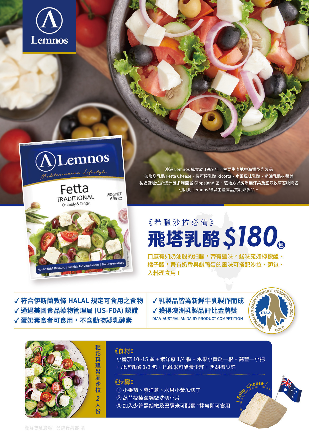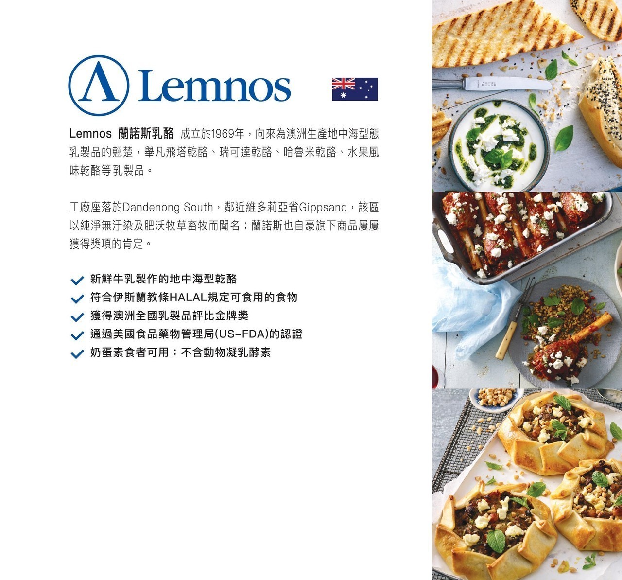 澳洲 Lemnos 成立於1969年,主要生產地中海類型乳製品,如飛塔乳酪Fetta Cheese、瑞可達乳酪Ricotta、水果風味乳酪、奶油乳酪抹醬等。