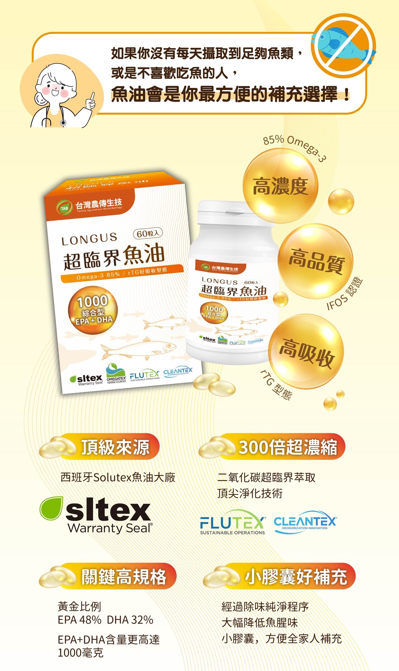 嚴選西班牙魚油大廠Solutex,魚油Omega-3濃度超過85%,高劑量的1000毫克EPA和DHA,暢快循環超有感 ! 超臨界流體萃取與專利淨化技術,全程採一段式連續製程,好吸收的rTG型態,快速補充。
