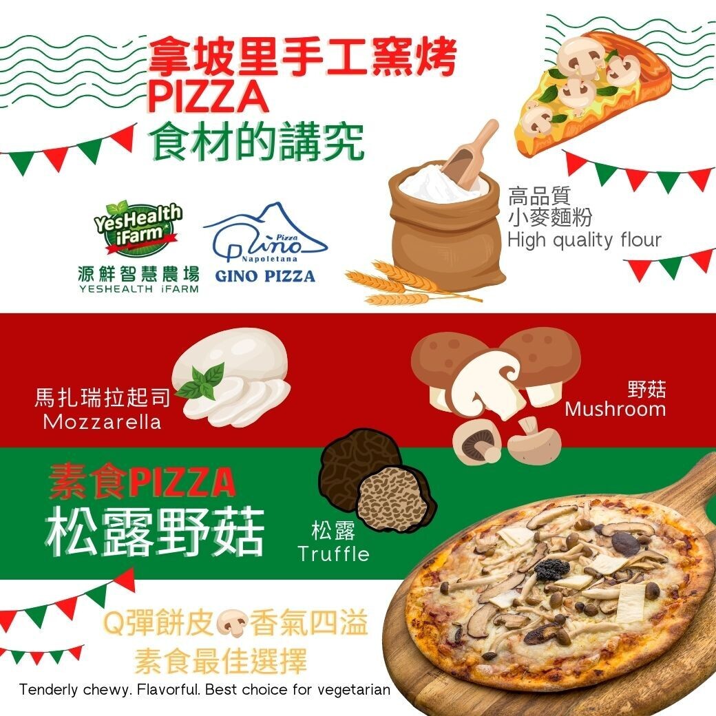 成分:高筋麵粉、水、莫扎瑞拉起司(巴氏殺菌牛乳、鹽、凝乳酵素、乳酸菌)、香菇平均值、杏鮑菇、素食夏季松露醬(蘑菇、水、葵花油、黑喇叭菇、夏季黑松露、鹽、特級初榨橄欖油、糖、玉米澱粉、植物纖維(菊苣)、香料、大豆卵磷脂、黑胡椒、檸檬酸)、鮮奶油、義大利海鹽、橄欖油