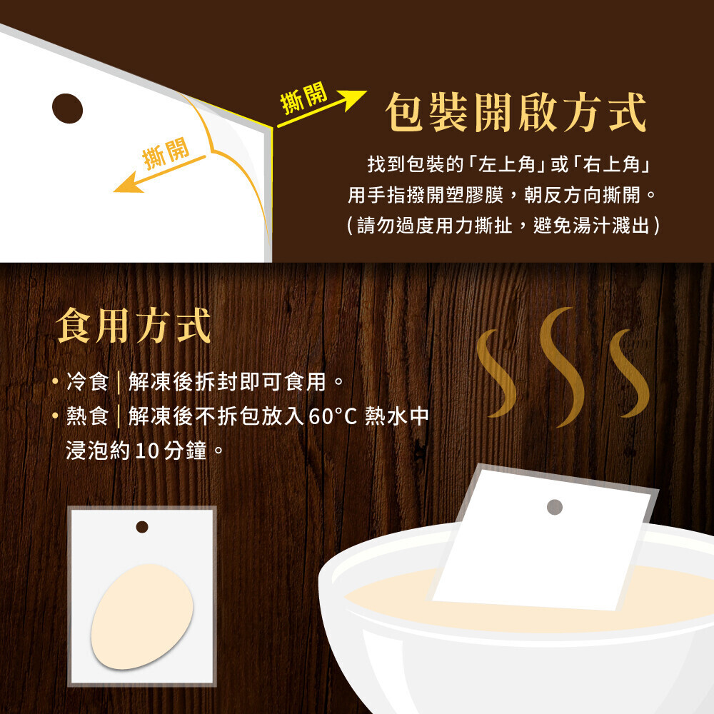 食用方式:解凍後即可食用,或解凍之後不拆包放入60°熱水中浸泡約10分鐘覆熱