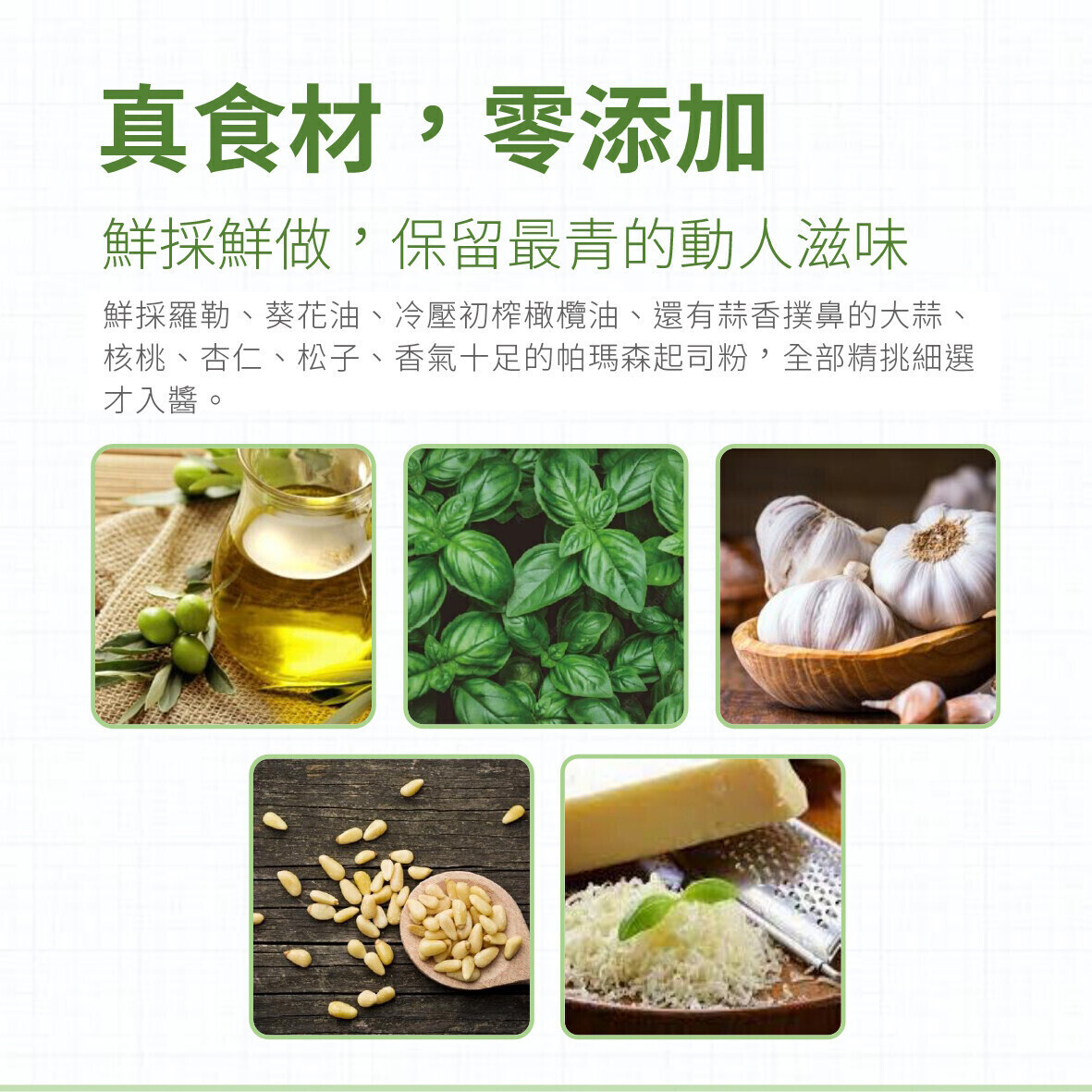 成分:葵花油、新鮮蘿勒、冷壓初榨橄欖油、帕馬森起司粉、新鮮蒜頭、核桃、杏仁、松子、鹽、黑胡椒粒