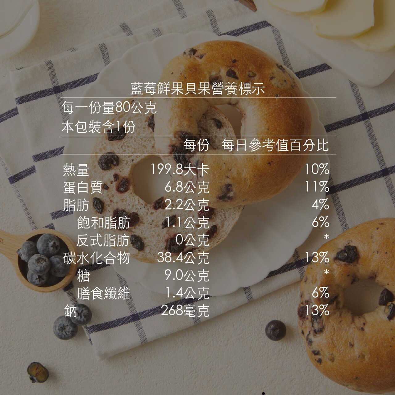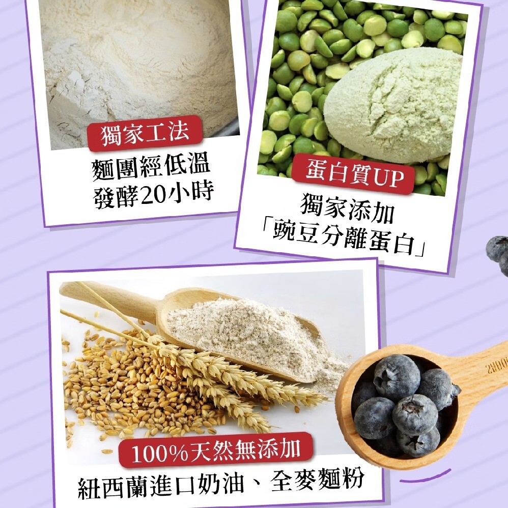 產品成份: 麵粉、水、全麥麵粉、藍莓乾 (藍莓、蔗糖、葵花籽油)、黑糖、奶油、豌豆分離蛋白、食鹽、酵母。