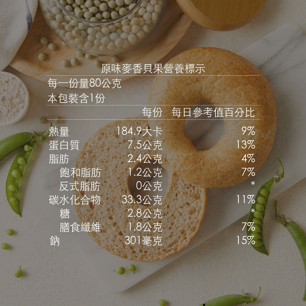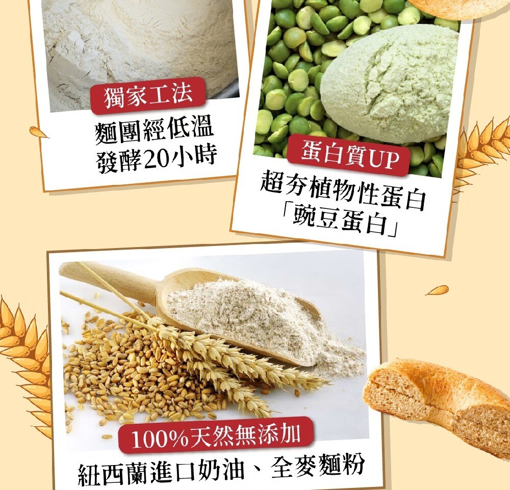 產品成份: 麵粉、水、全麥麵粉、黑糖、奶油、豌豆分離蛋白、食鹽、酵母。