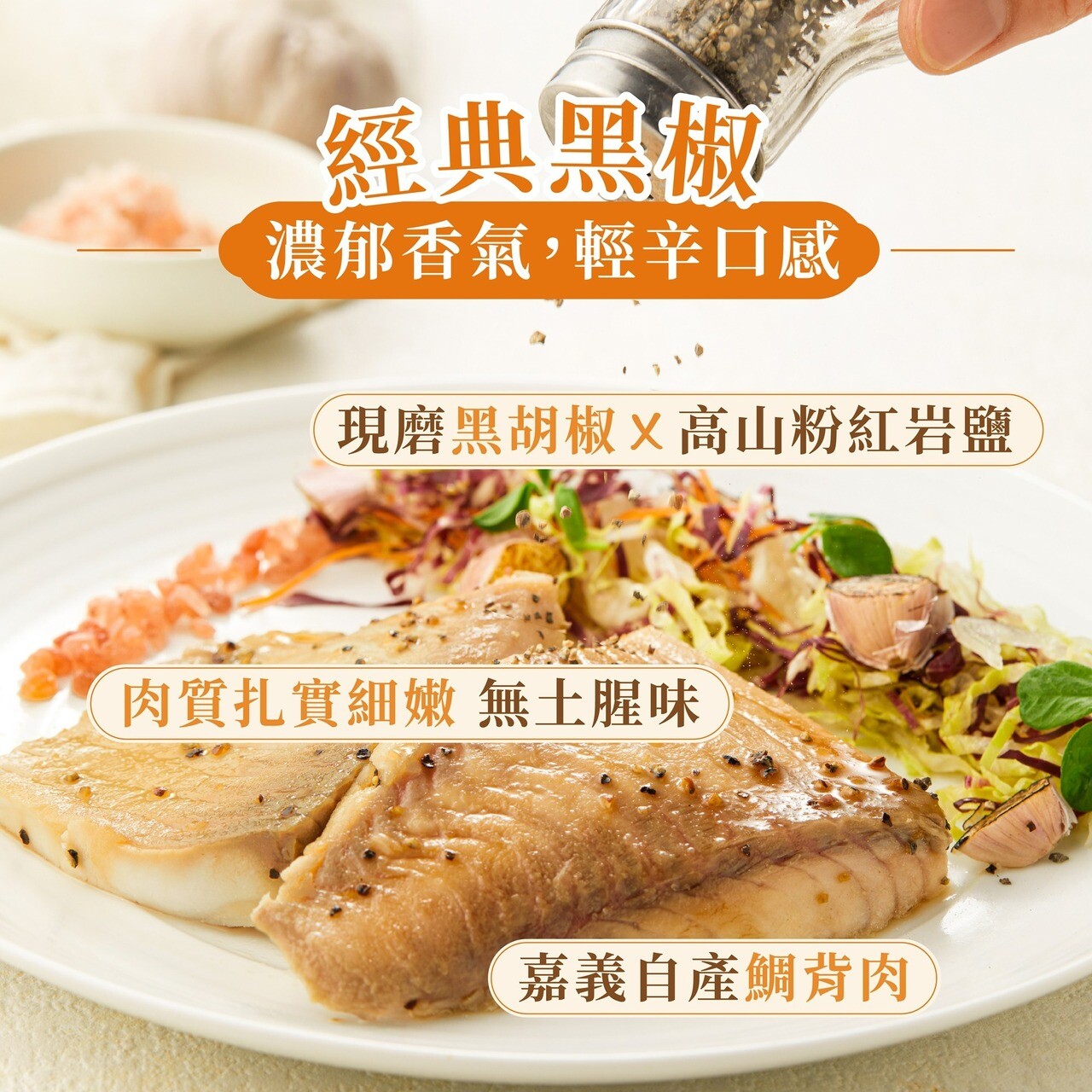 成份:台灣鯛魚片、黑胡椒、香蒜粉(蒜粉、品質改良劑(二氧化矽))、喜馬拉雅粉紅鹽