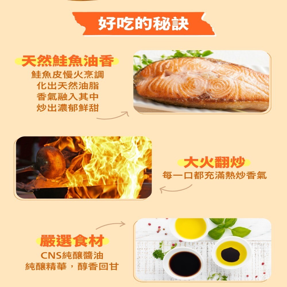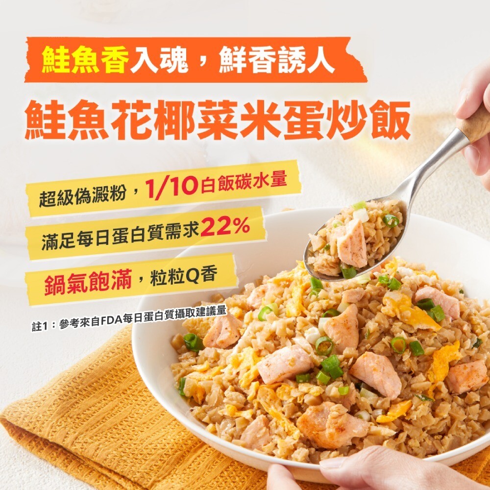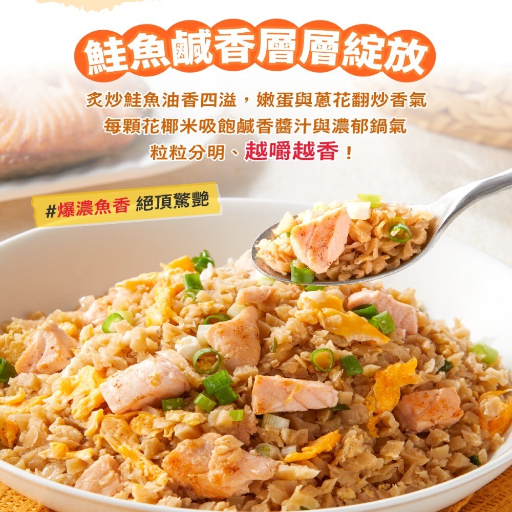 產品成分 : 花椰菜米、雞蛋、鮭魚、玄米油、醬油、青蔥、蒜、白胡椒粉