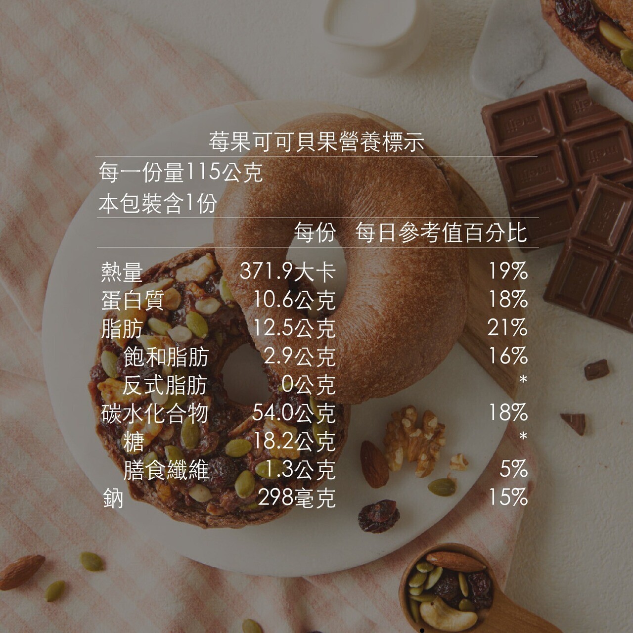 *過敏原資訊: 本產品含有麩質穀類、堅果、牛奶、大豆及其製品,不適合對其過敏者食用