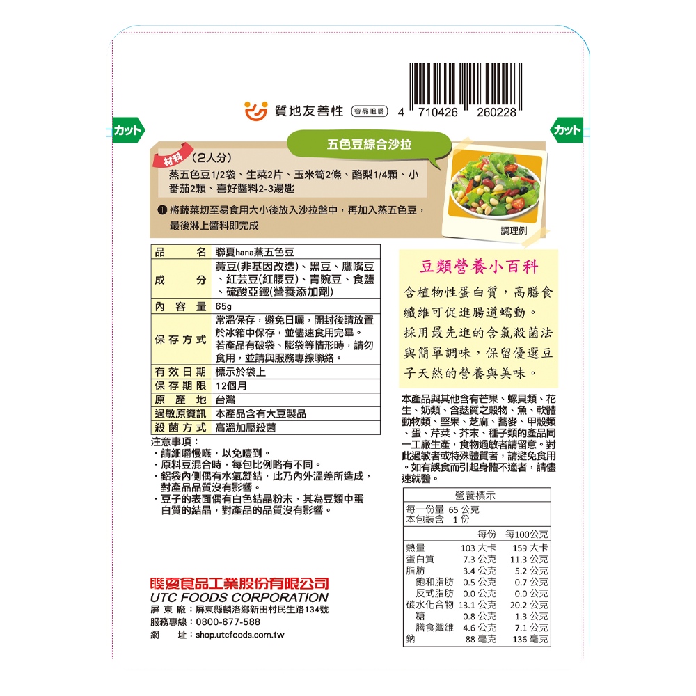 成分:黃豆(非基因改造)、青碗豆、黑豆、回回豆、紅腰豆、食鹽、檸檬酸亞鐵鈉(營養添加劑)