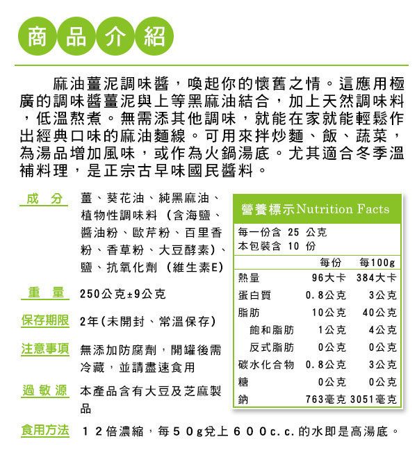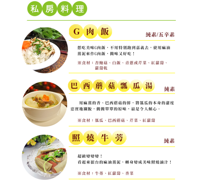 ●懶人餐的好搭檔,不管煮麵或燙煮青菜,麻油薑泥拌一拌,濃郁滋味馬上讓食物味道豐富起來,強推此款為冰箱必備品。