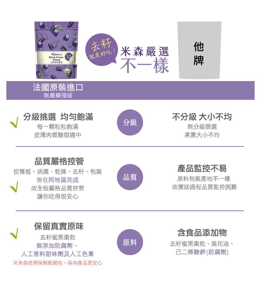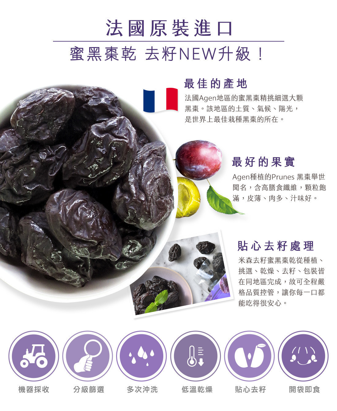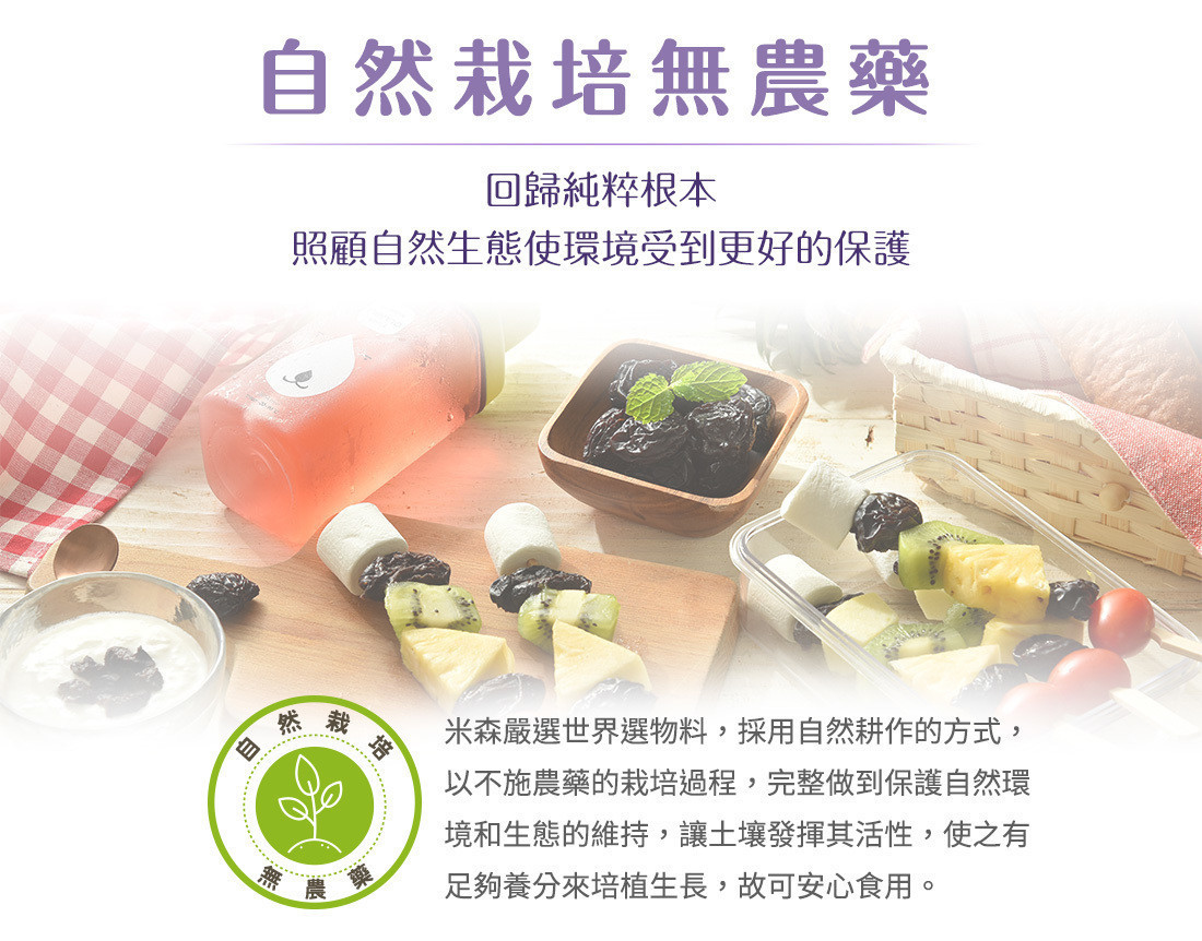 米森嚴選法國Agen所產的昂特蜜黑棗乾,黑棗樹經常修剪,讓果實有充分的空氣對流及陽光照射,成就顆顆飽滿,肉質酸甜適中的蜜黑棗乾。且通過IGP(法定地理區域產品保護制度)的驗證,從種植、挑選、乾燥、包裝都在同區域完成,因此全程嚴格控管品質安全,再加上農場不使用農藥的栽種方式,讓你每一口都吃得很安心。
