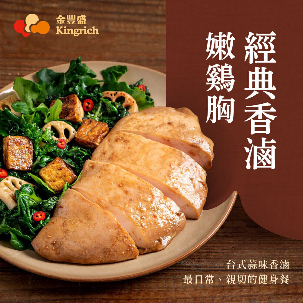專業烹調設備,中心溫度達禽肉烹煮標準 74 ℃,美味更安心 金豐盛經典嫩雞胸,給你蛋白質補充的即刻應援! 經典蒜鹽口味,台式蒜香及黑胡椒點綴,保留雞胸低脂的清爽滋味。