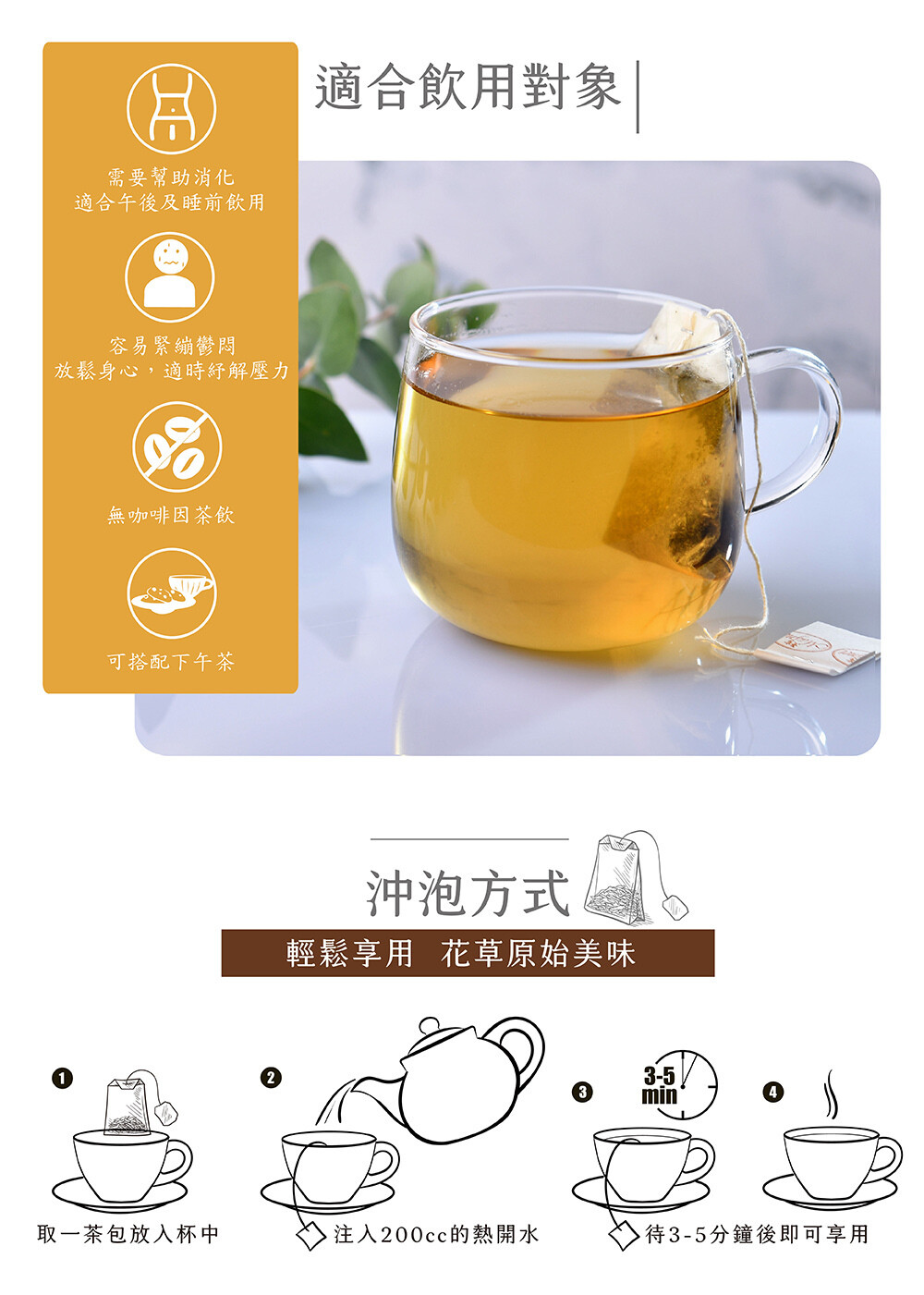 純淨花草成分、無添加人工添加物、無咖啡因