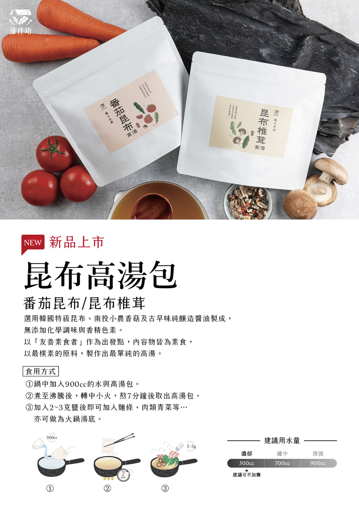 選用韓國高興特級昆布、南投小農黑早香菇及台灣純釀造醬油製成,無添加化學調味與香精色素。