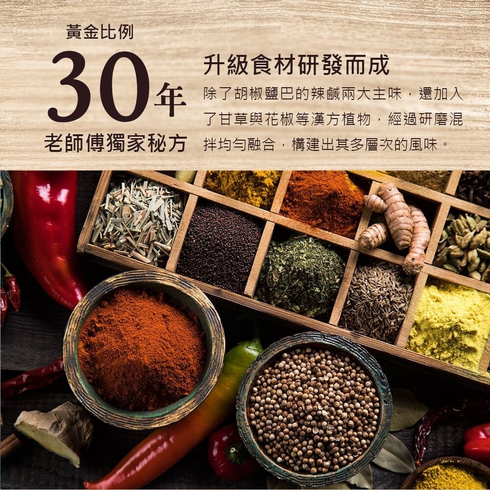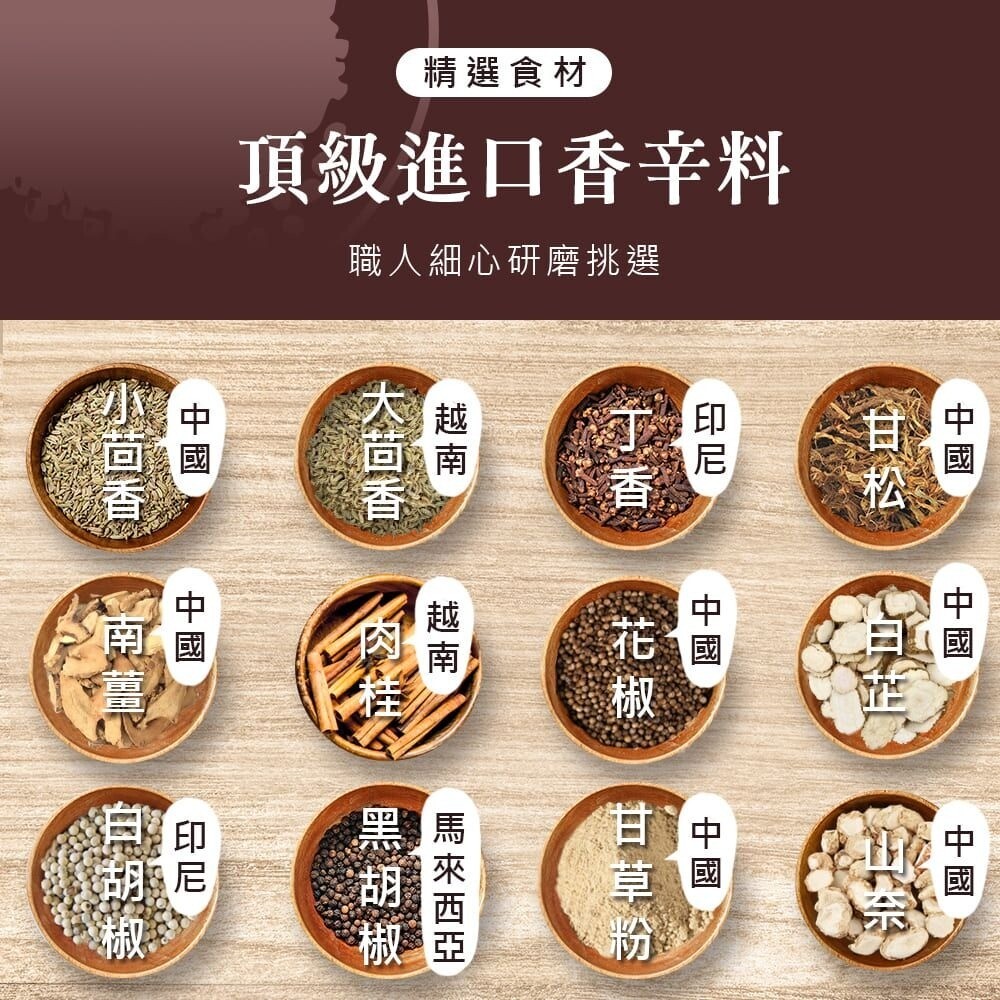 成份:鹽、L-麩酸鈉(調味劑)、黑胡椒、肉桂、白胡椒、甘草粉、二氧化矽(品質改良劑)、花椒、大茴香、小茴香、丁香、甘松、南薑、山奈、白芷