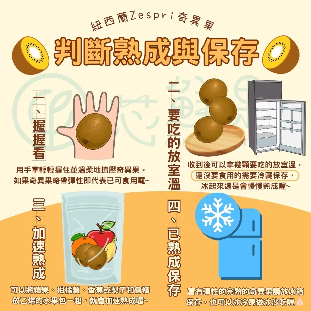 冷藏保存:已經熟透的奇異果建議放入冰箱冷藏,這樣可以延長其保鮮期,保持最佳的口感。建議在1-2週內食用完畢。
