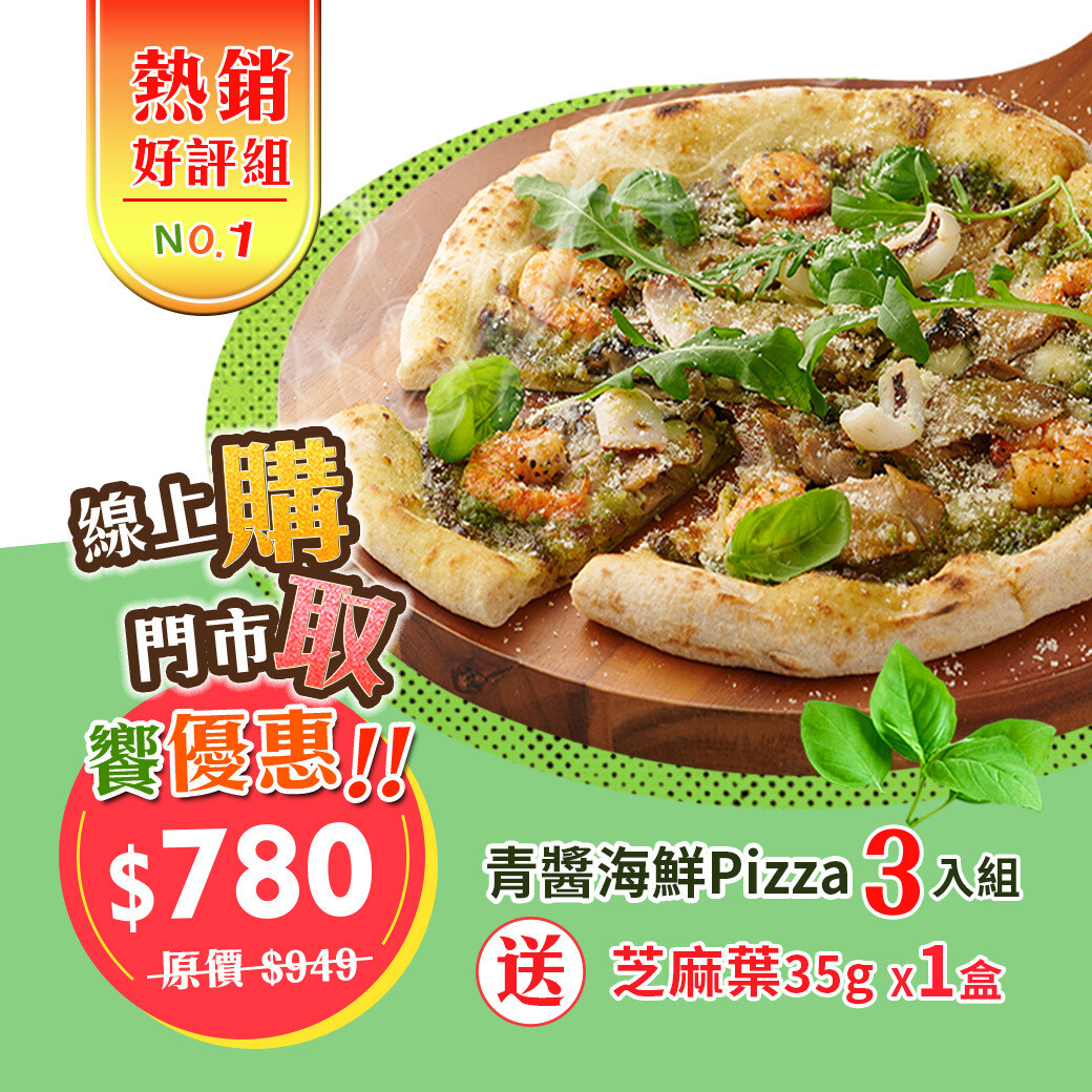 商品特色:安心青醬、台灣高品質小麥麵粉、馬扎瑞拉天然起司、飽滿的海鮮配料,CP值超高。