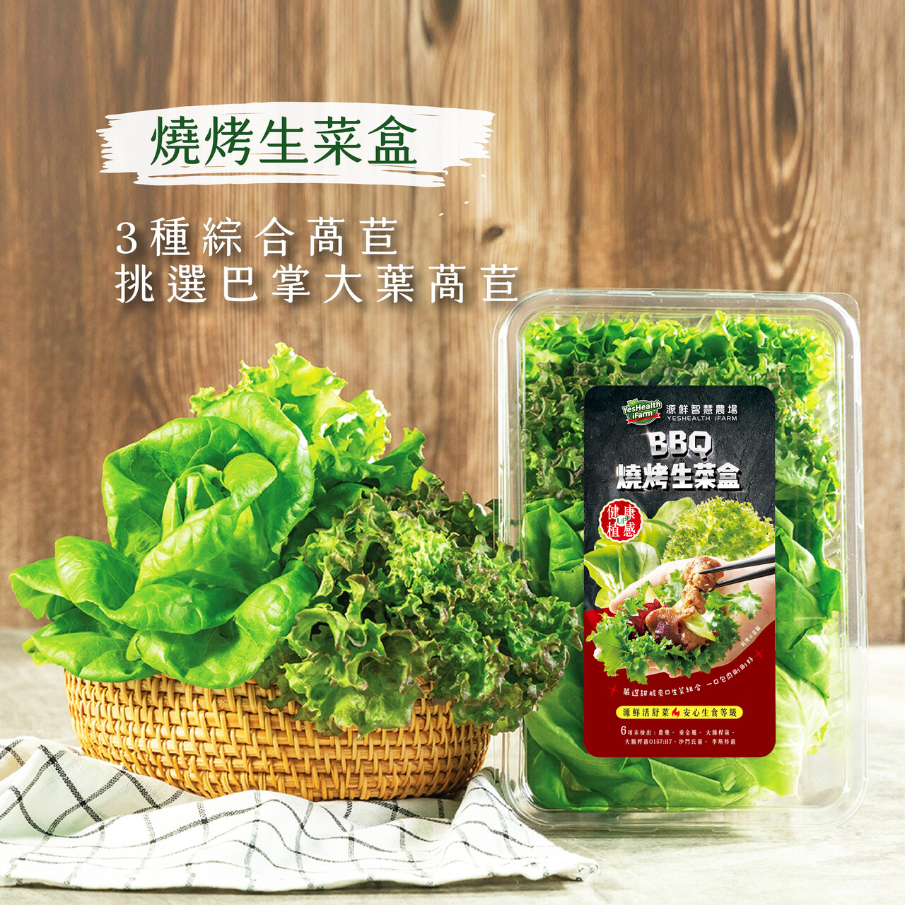 備 註: 燒烤生菜盒組紅捲、綠精靈、蘿蔓3品項萵苣為主,本農場保有變更內容品項之權利,但每盒保有3種適合之萵苣。