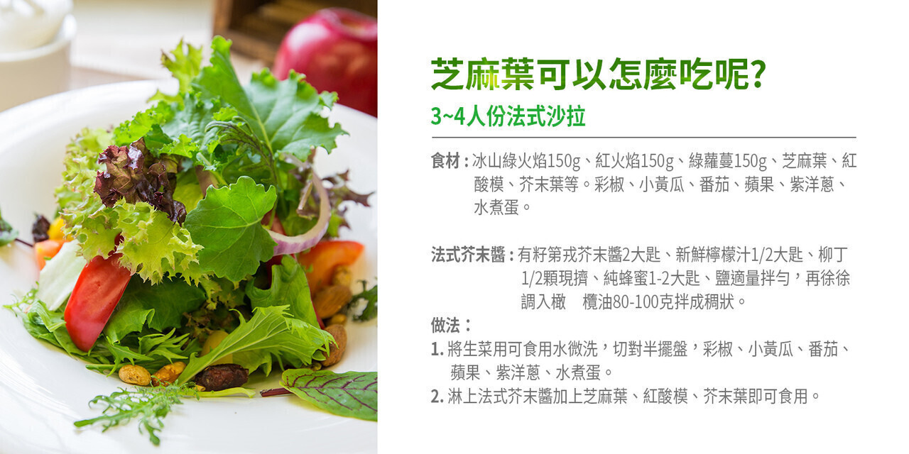 料理方式:BBQ烤肉絕配、歐式芝麻葉沙拉、披薩、三明治佐配料、牛排料理增添層次風味。