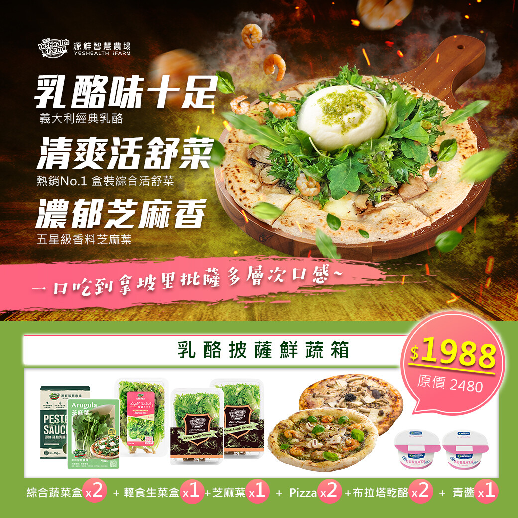 組合內容物: 綜合蔬菜盒X2+輕食生菜盒X1+歐洲芝麻葉X2+青醬海鮮PIZZA+松露野菇PIZZA+布拉塔乾酪X2