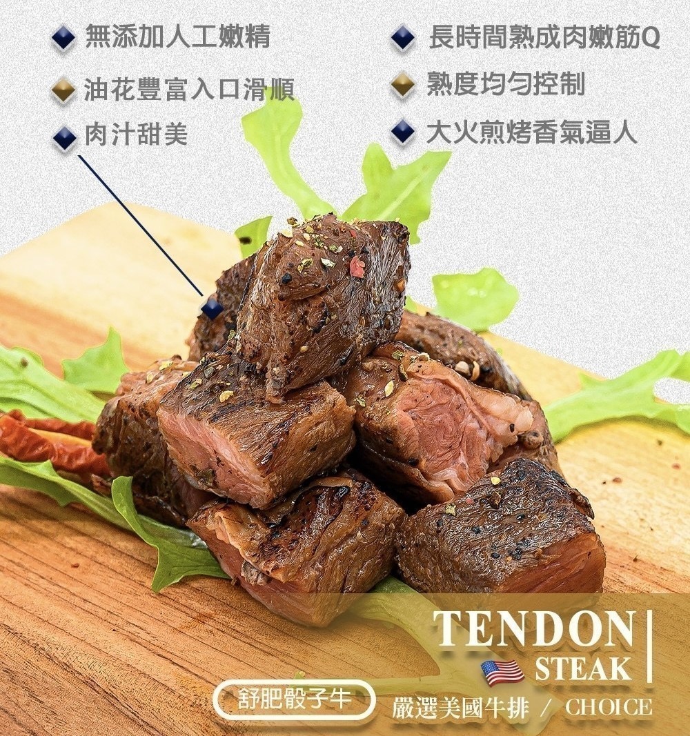 #舒肥骰子牛選用的牛肉部位是美國prime背肩,油花較豐富、肉質鮮甜軟嫩,較肥部分可用大火將其煎至金黃非常的好吃。處理製程冷凍直接鋸切,人工將脂肪含量過高的挑除,使用肉品都是非常高等級肉品,每份一定會有肥瘦分佈,請可以接受者再下單。
